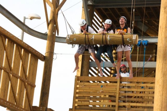 • كما يُمكنك السير على الأخشاب الصغيرة المُعلقة في الهواء مع التشبُث بالعديد من الحبال في الحديقة المائية في العين الإماراتية.